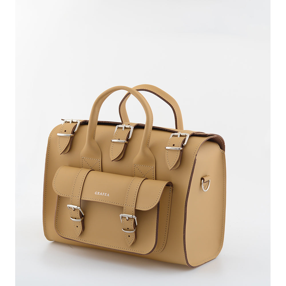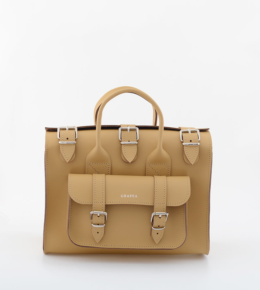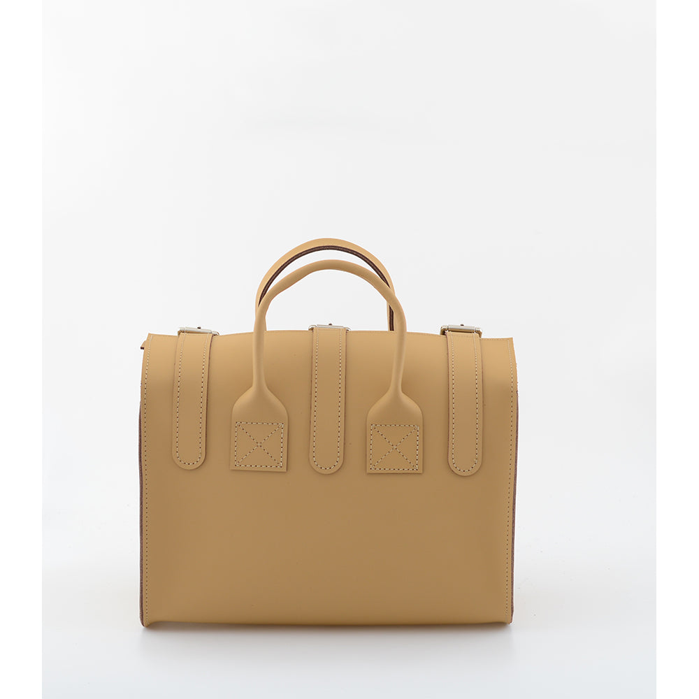 One large front pocket, two handles on the top and a long adjustable/detachable shoulder strap.