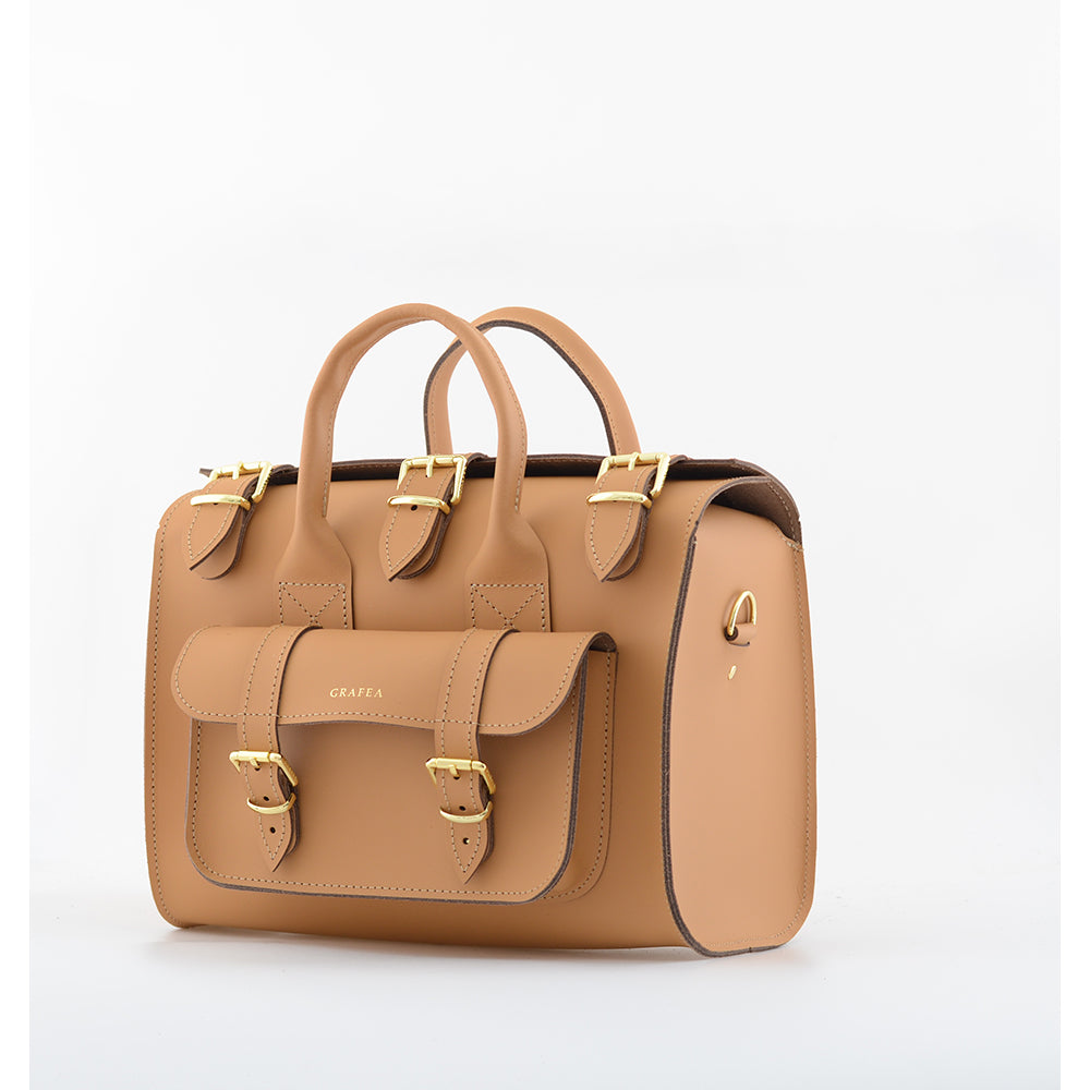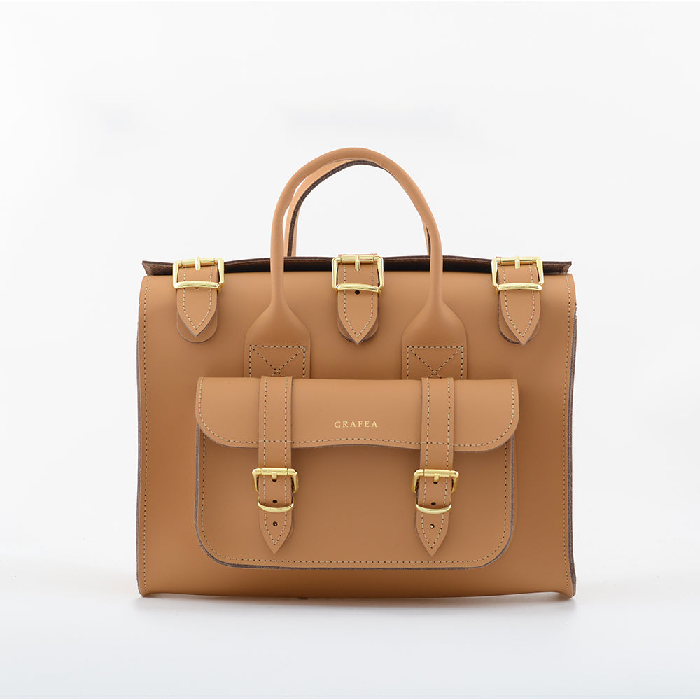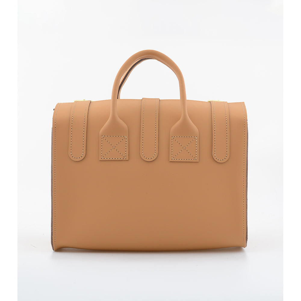 One large front pocket, two handles on the top and a long adjustable/detachable shoulder strap.