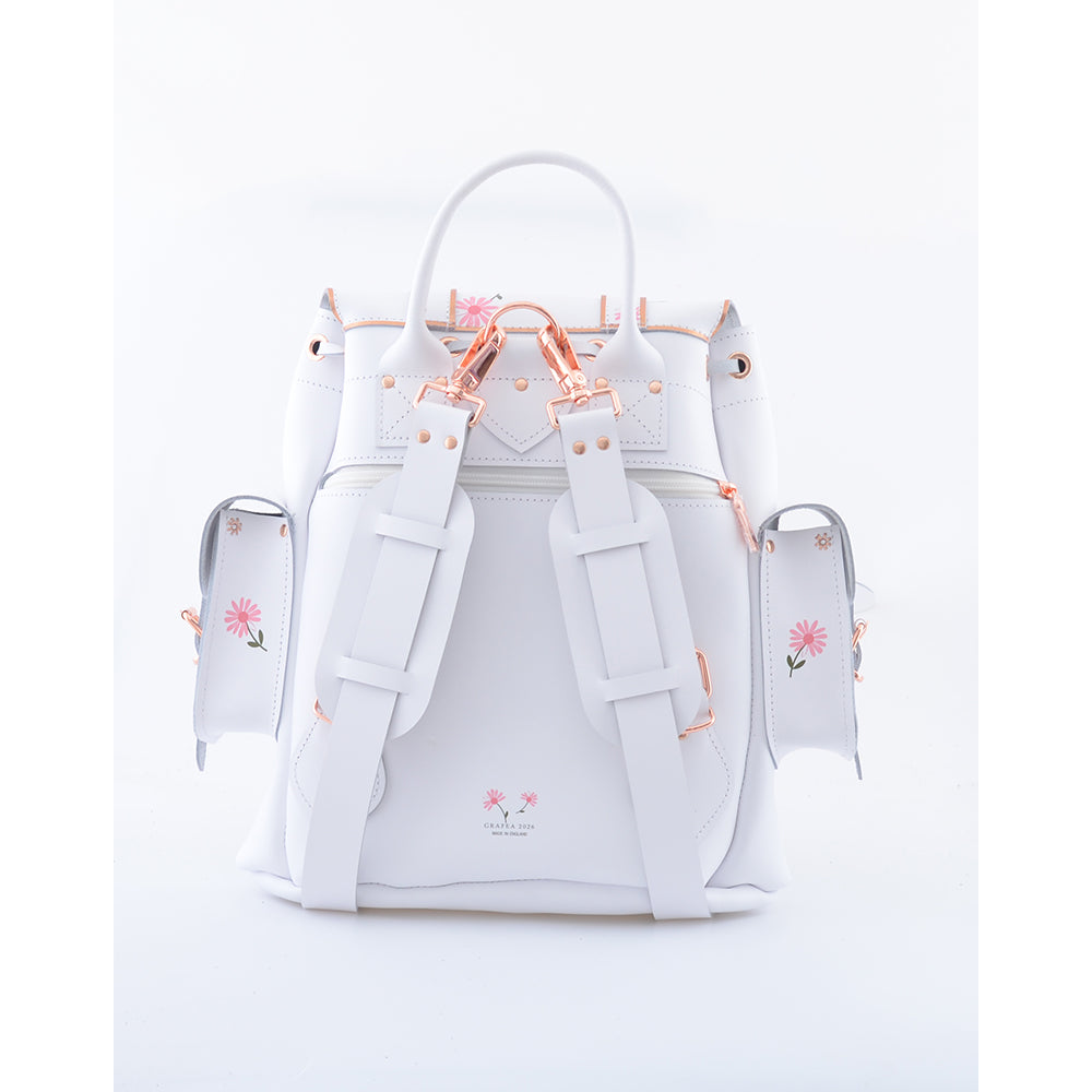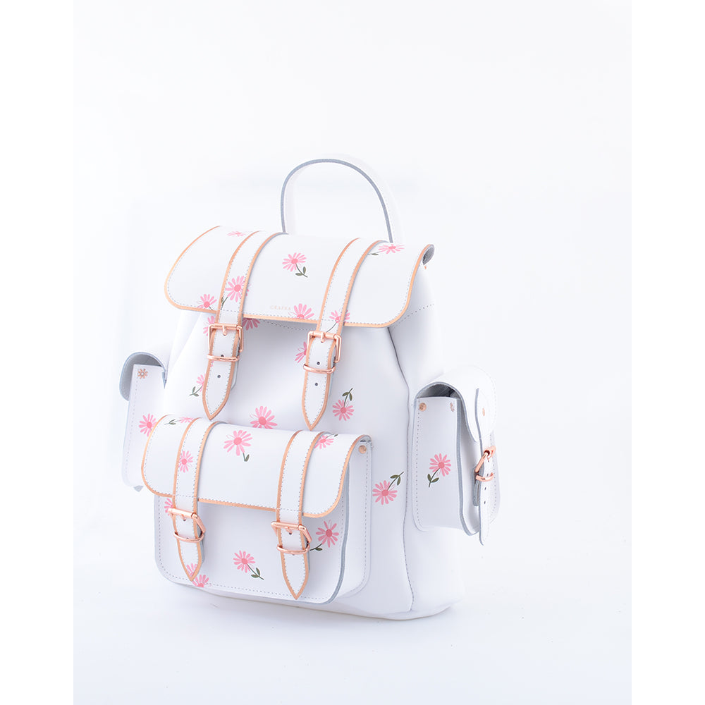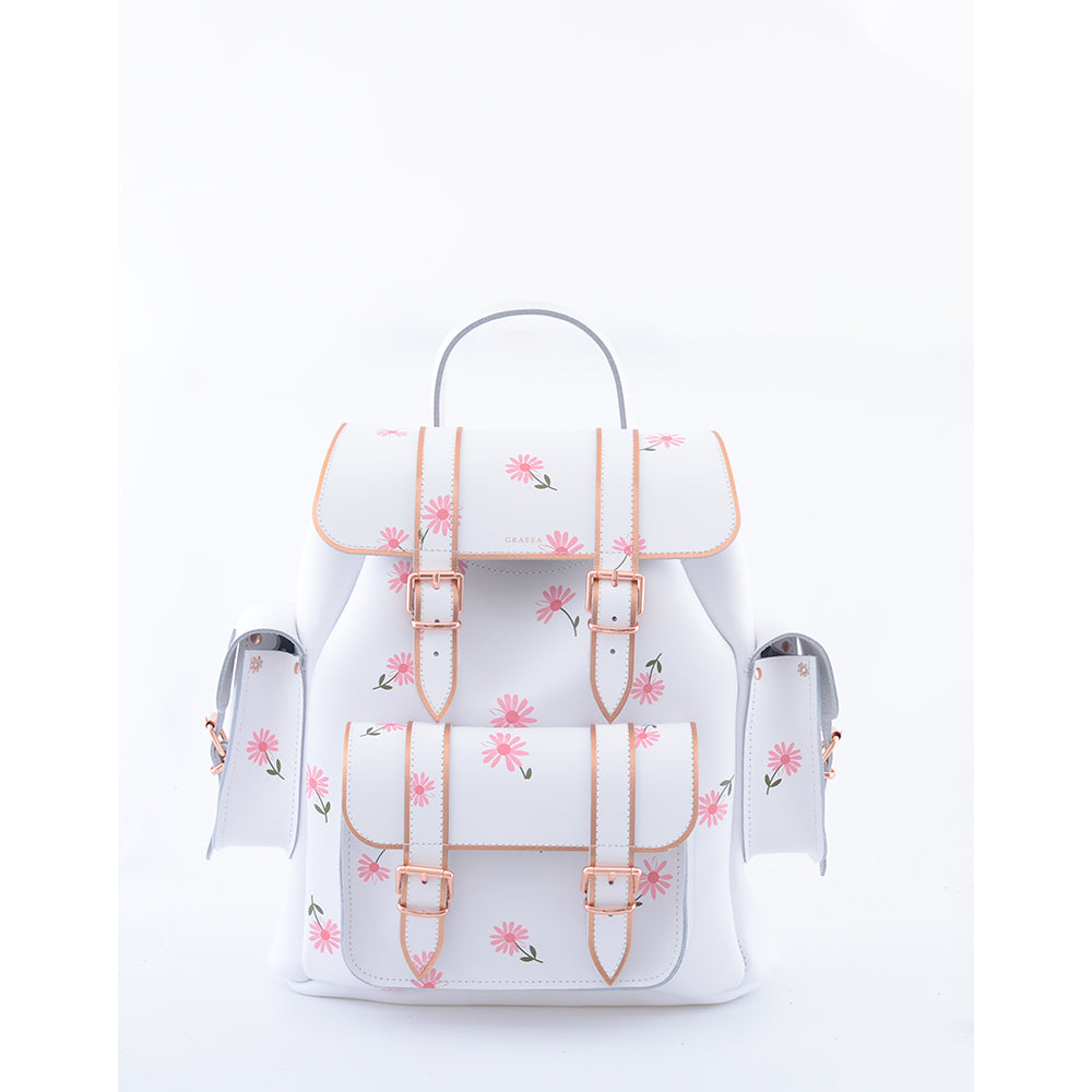 One front pocket that fastens with two magnetic buckles. The bag has got a handle and two leather straps and shoulder pads. The straps are adjustable and detachable.