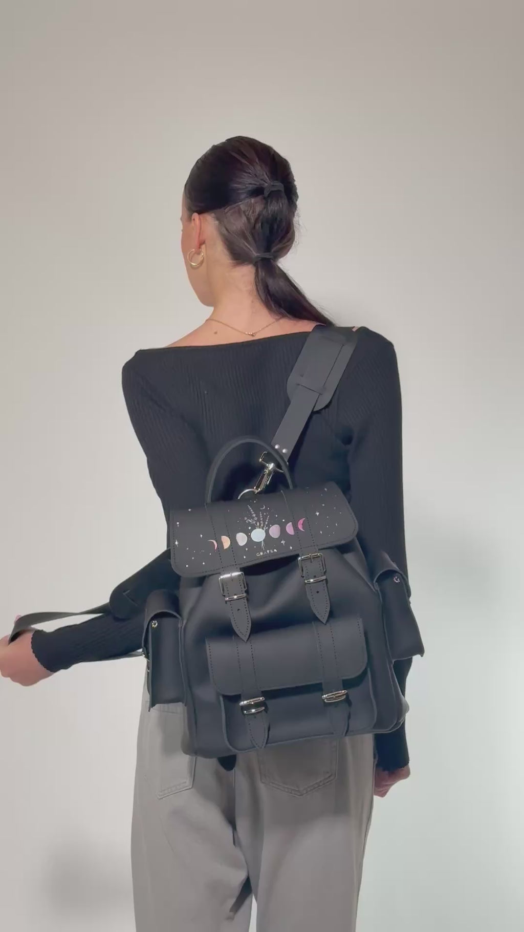 This backpack has got a large main compartment that can be tightened using a leather cord and then closed with two magnetic buckles for easy access.