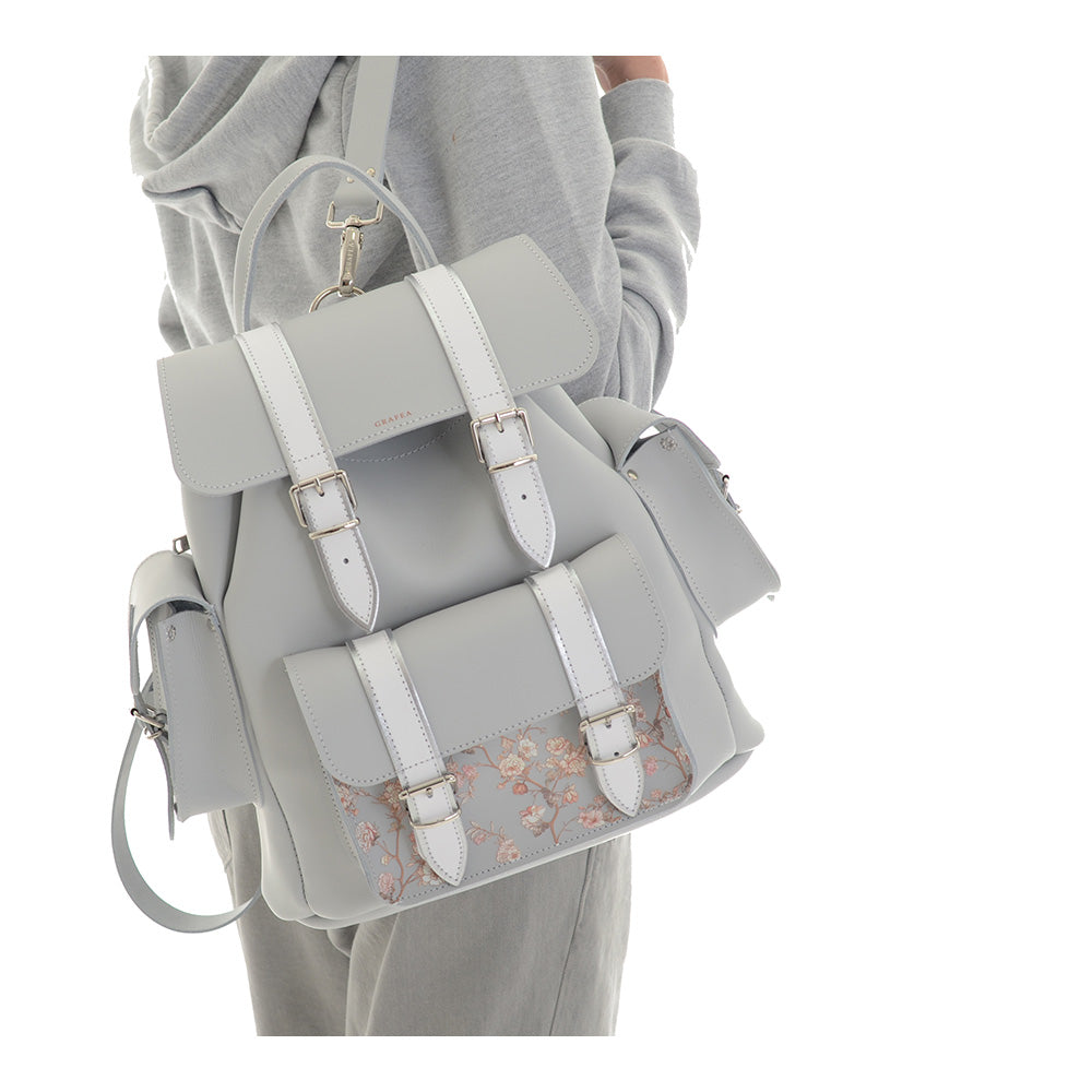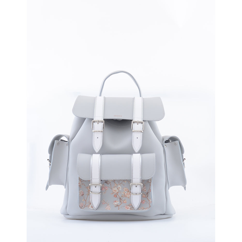 One front pocket that fastens with two magnetic buckles. The bag has got a handle and two leather straps and shoulder pads. The straps are adjustable and detachable.