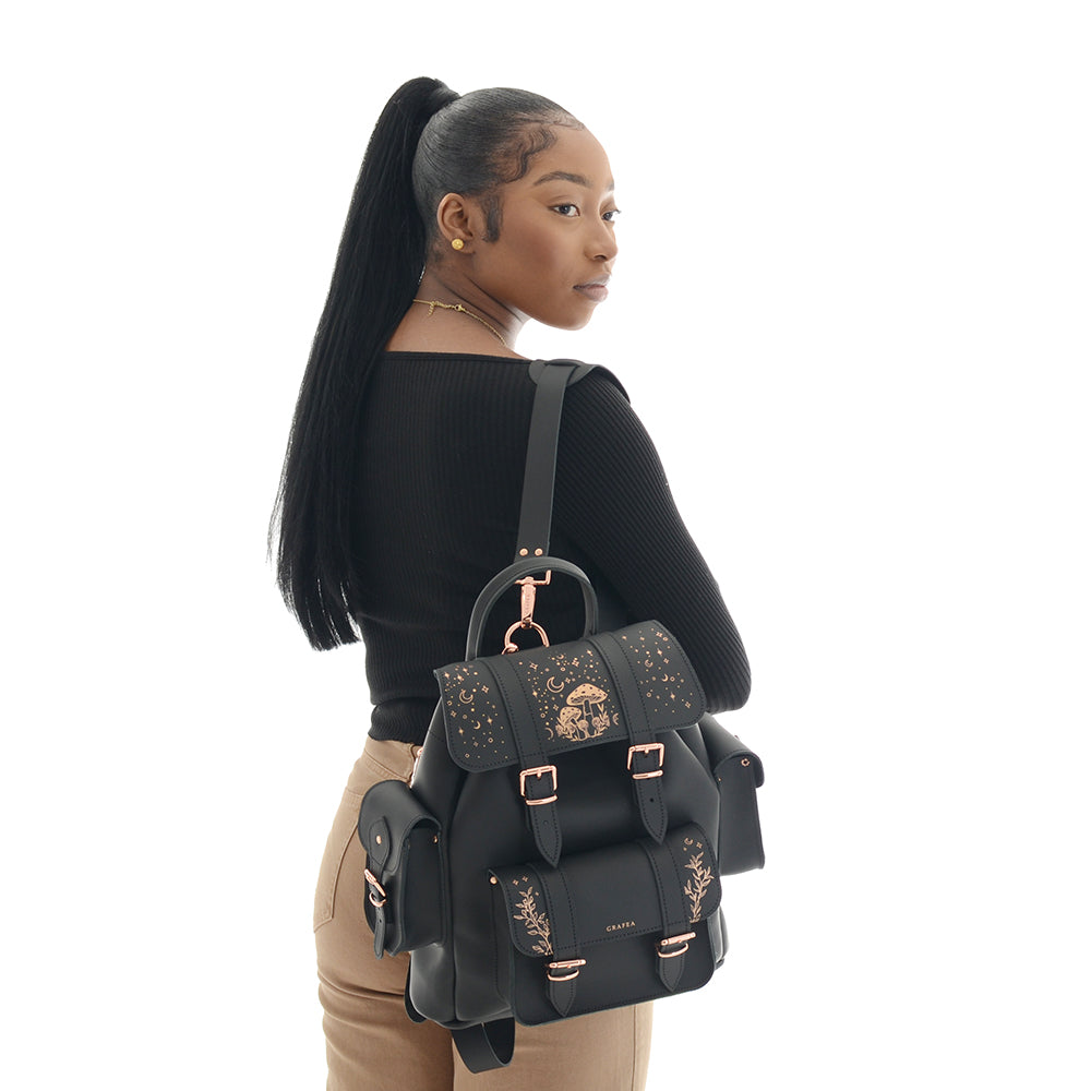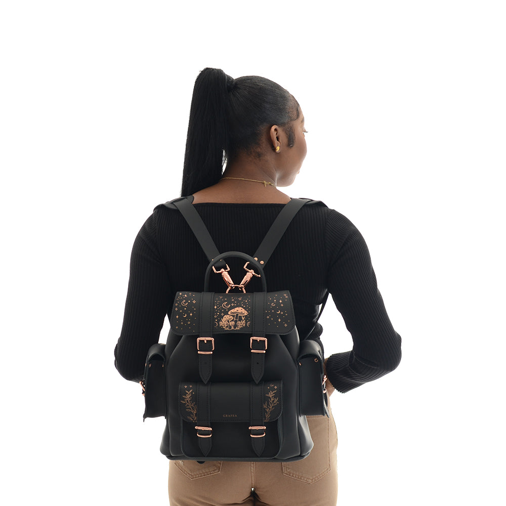 This backpack has got a large main compartment that can be tightened using a leather cord and then closed with two magnetic buckles for easy access.