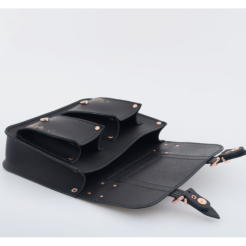 It fastens with two magnetic clips on the front, for a quick and easy access.