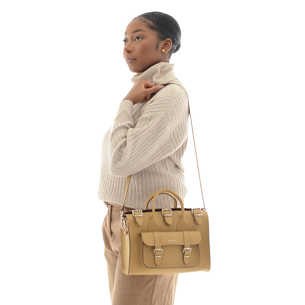 Die Tasche hat zwei Griffe und einen Schulterriemen, der einstellbar und wieder abnehmbar ist.