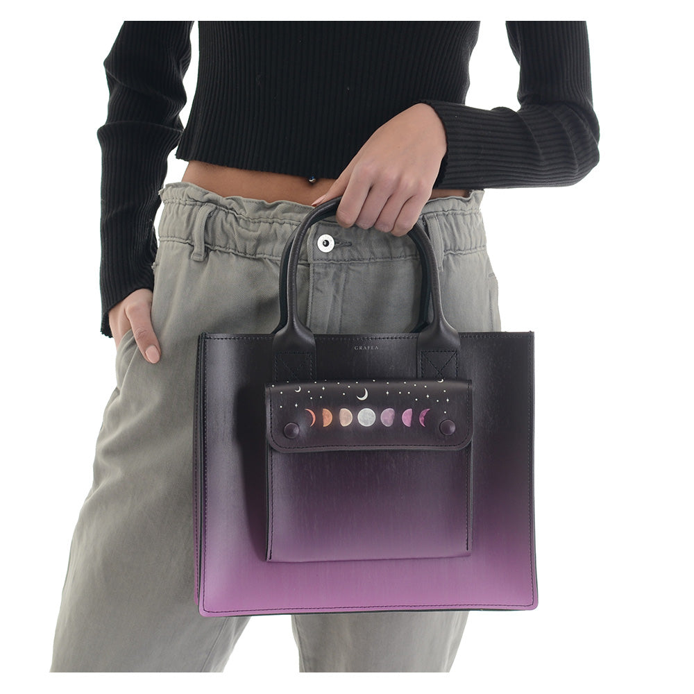 Die Ledertasche verfügt über ein Hauptfach und ein kleineres Frontfach, das mit einer Metallschnalle verschließbar ist.