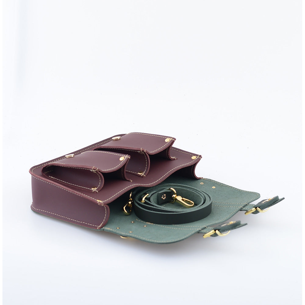 Die Tasche hat zwei Vordertaschen, ein Innenfach und einen verstellbaren Schultergurt (abnehmbar).