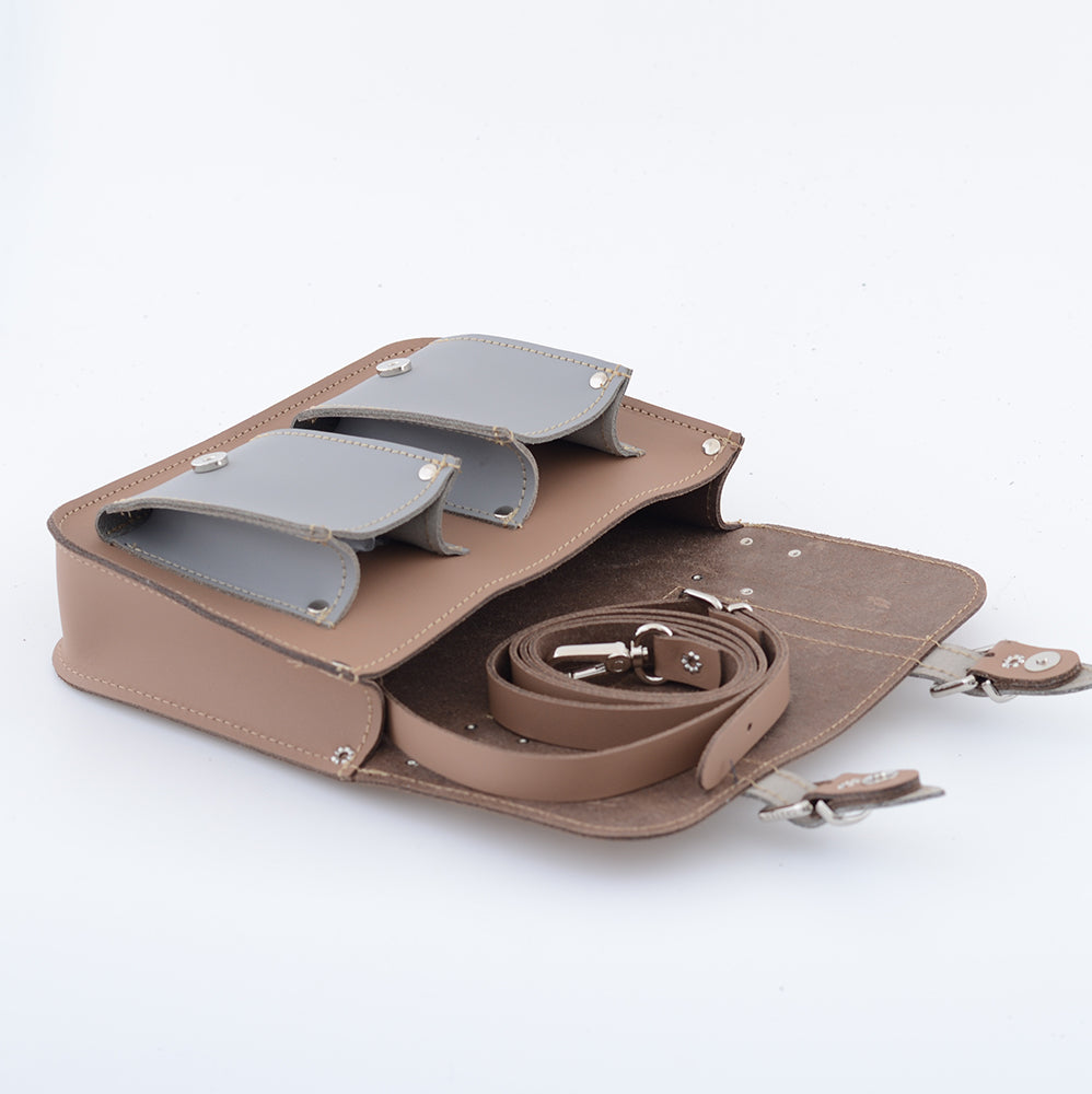 Die Tasche hat zwei Vordertaschen, ein Innenfach und einen verstellbaren Schultergurt (abnehmbar).