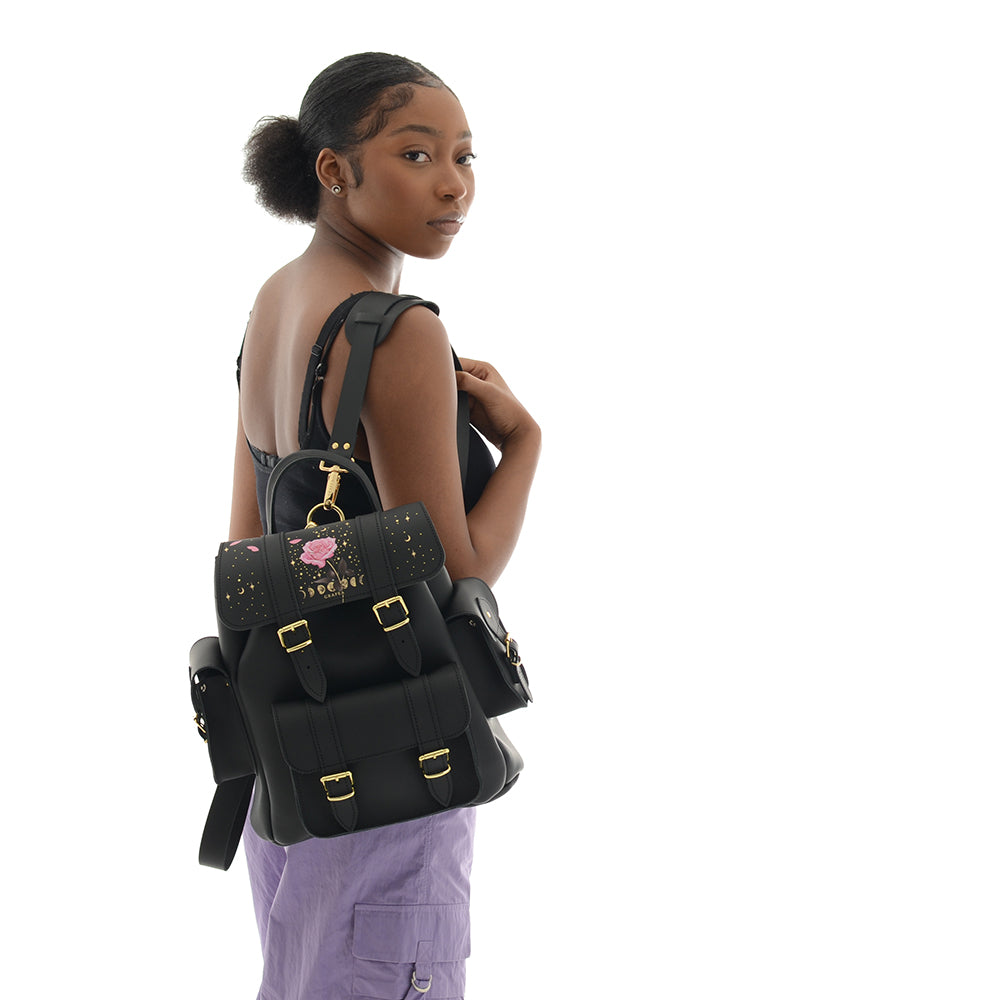 Das Modell hat ein Frontfach und zwei kleine Seitenfächer, die alle mit echten Metallschnallen verschließbar sind.