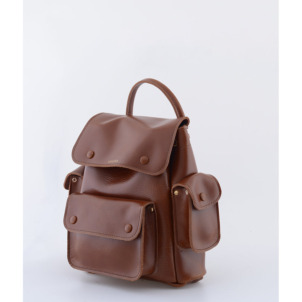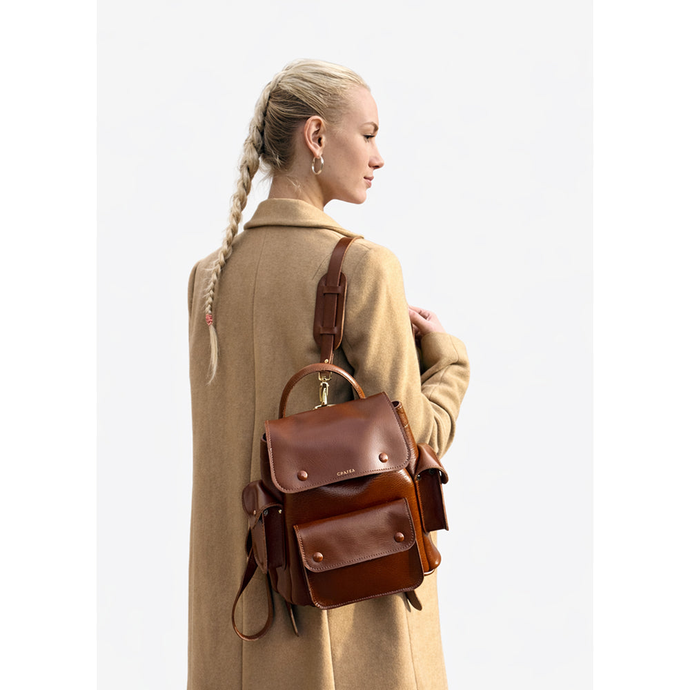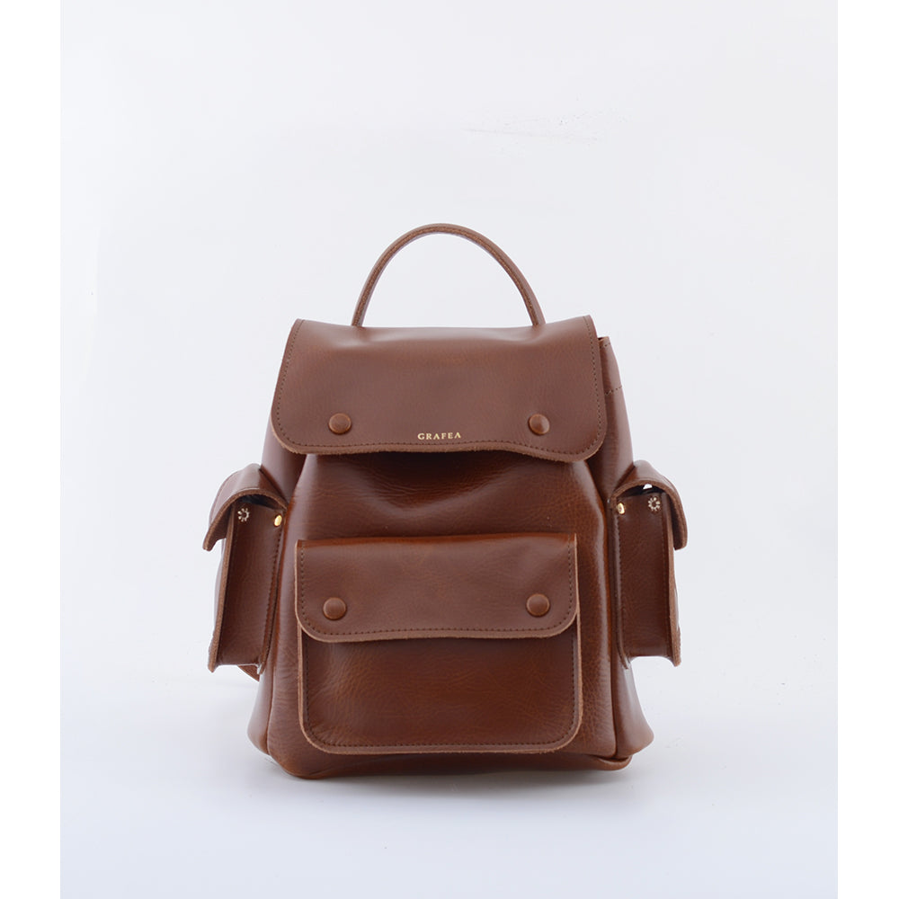 フロントポケットは2つのマグネットバックルで留められます。ハンドル、2本のレザーストラップ、ショルダーパッドが付いています。ストラップは調節可能で取り外し可能です