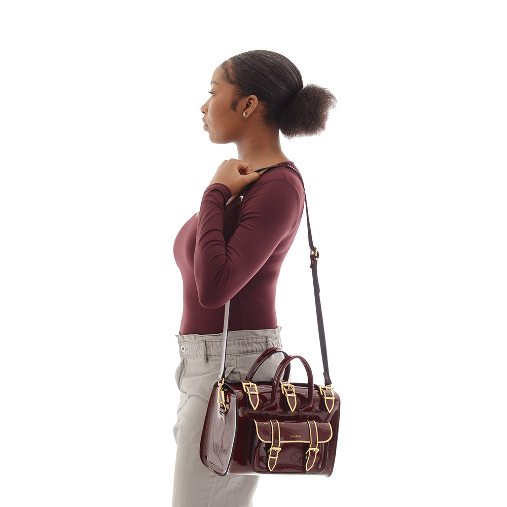 这款手提包内里具有很大的收纳空间,以金属磁扣闭合。